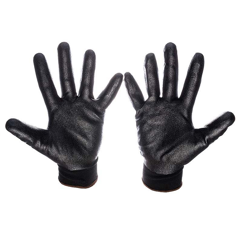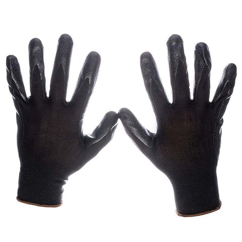 Black nitrile foam dipped, palm coated, black nylon Gloves.