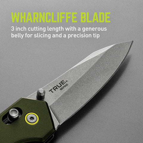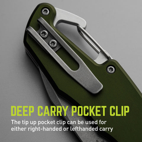 The REPOSE™ features a 3” wharncliffe blade with a generous belly for slicing and a precision tip for controlled cuts when the details matter. The crossbar lock keeps the blade secure while the lightweight aluminum handle features an integrated carabiner clip, and an ambidextrous deep carry pocket clip for easy and convenient every day carry.